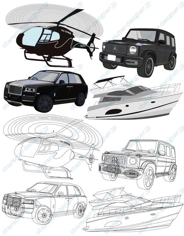 自動車を中心に、ヘリコプターやクルーザーなどのオリジナルアイテムを描きました。